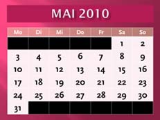 | 09.05 | Europatag der Europäischen Union - Frankreichs Außenminister Robert Schuman schlug am 9. Mai 1950 vor, eine Produktionsgemeinschaft für Kohle und Stahl zu schaffen. Dies mündete in die Montanunion, dem Grundstein der heutigen Europäischen Union. |