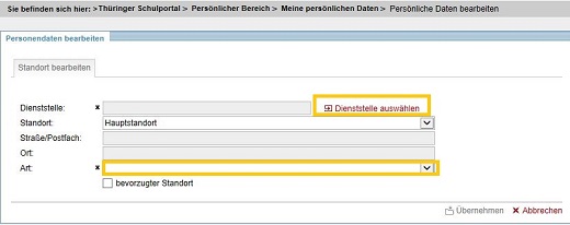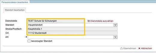 Mit der Auswahl einer konkreten Dienststelle werden die Stammdaten in die entsprechenden Felder übernommen. Bei Schulen/ Dienststellen mit mehreren Schulteilen/ Standorten können Sie durch Auswahl des Standortes Ihre Angaben verfeinern und definieren, an welchem konkreten Standort der Schule Sie hauptsächlich arbeiten.