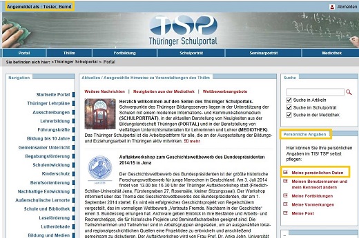 Sie erreichen die Box "Persönliche Angaben" nach Anmeldung am TSP über die Startseite des Thüringer Schulportals in der rechten Spalte. Diese Box ist nicht öffentlich und nur für Sie persönlich über Ihren Benutzernamen/ Kennwort zugänglich.