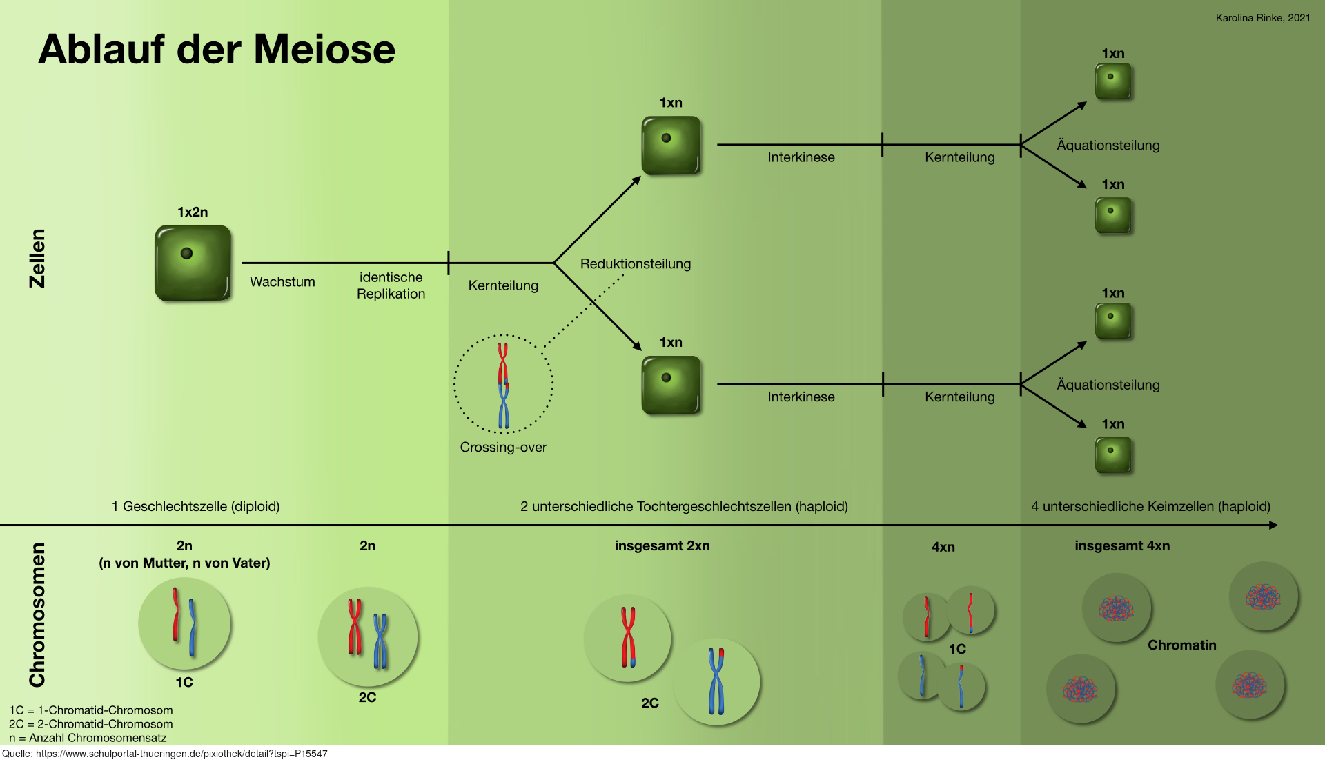 Das Bild gehört zur Serie "Mitose und Meiose" und verdeutlicht die Meiose in einer Übersichtsdarstellung. Variante: farbig; beschriftet; farbiger Hintergrund. Es gelten die Nutzungsbedingungen der Mediothek und Pixiothek.
