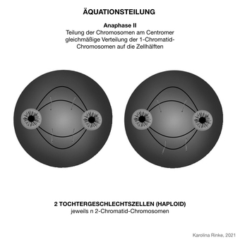 Das Bild gehört zur Serie "Mitose und Meiose" und verdeutlicht den Ablauf der Meiose, hier die Anaphase II. Variante: s/w. Es gelten die Nutzungsbedingungen der Mediothek und Pixiothek.