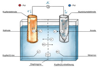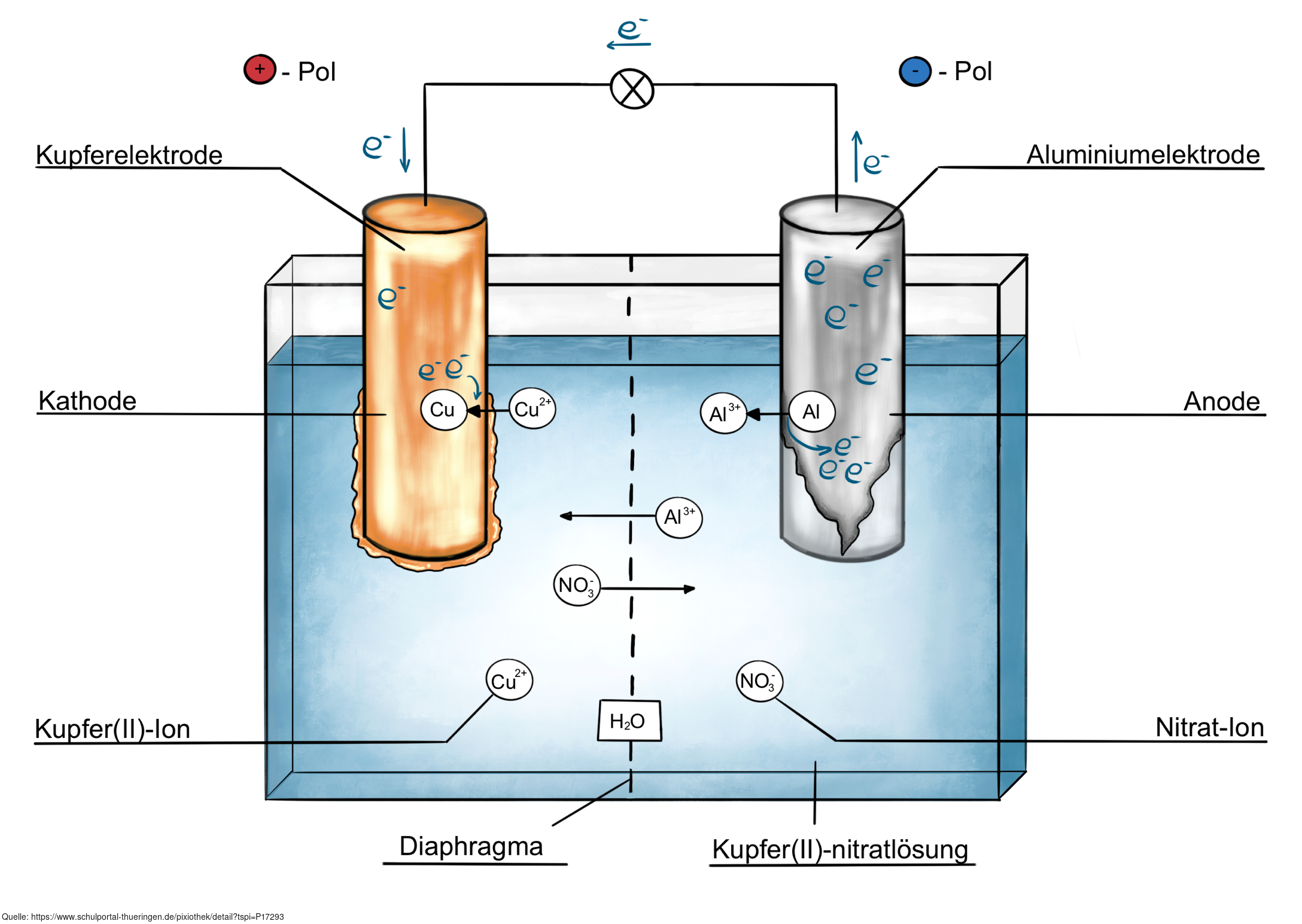 Das Bild gehört zur Serie "Elektrochemie". Es verdeutlicht den Aufbau einer Galvanischen Zelle am Beispiel einer Kupfer(II)-nitrat-Lösung. Bild-Variante: farbig, beschriftet, ohne Erläuterung. Es gelten die Nutzungsbedingungen der Mediothek und Pixiothek.