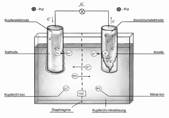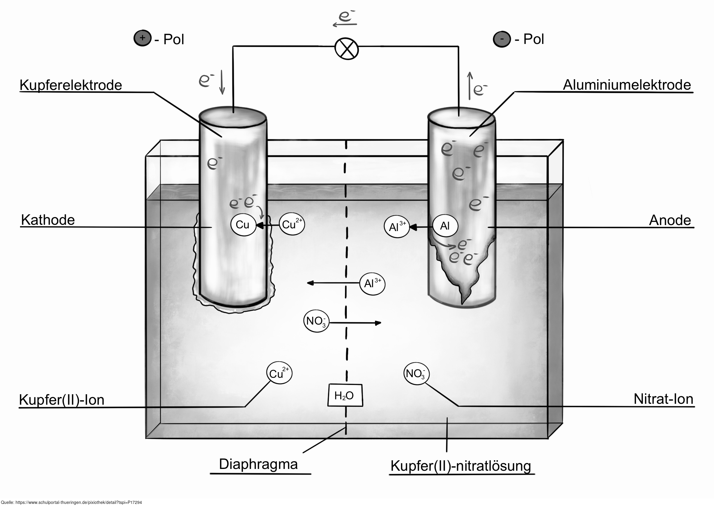 Das Bild gehört zur Serie "Elektrochemie". Es verdeutlicht den Aufbau einer Galvanischen Zelle am Beispiel einer Kupfer(II)-nitrat-Lösung. Bild-Variante: s/w, beschriftet, ohne Erläuterung. Es gelten die Nutzungsbedingungen der Mediothek und Pixiothek.