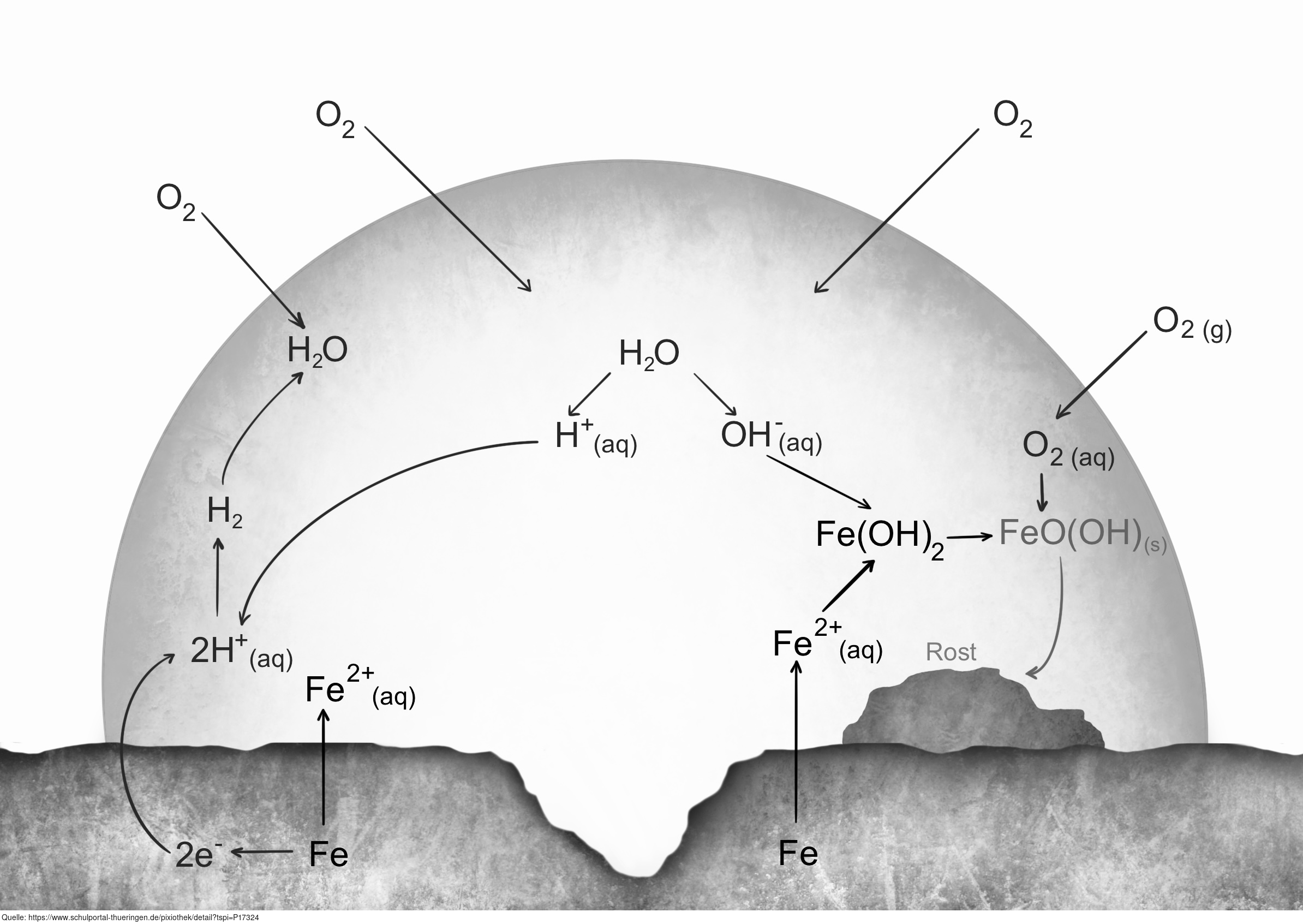 Das Bild gehört zur Serie „Korrosion und Korrosionsschutz“. Es verdeutlicht den Prozess der Säurekorrosion an einem Eisenwerkstoff. Bild-Variante: s/w, beschriftet, ohne Erläuterung. Es gelten die Nutzungsbedingungen der Mediothek und Pixiothek.