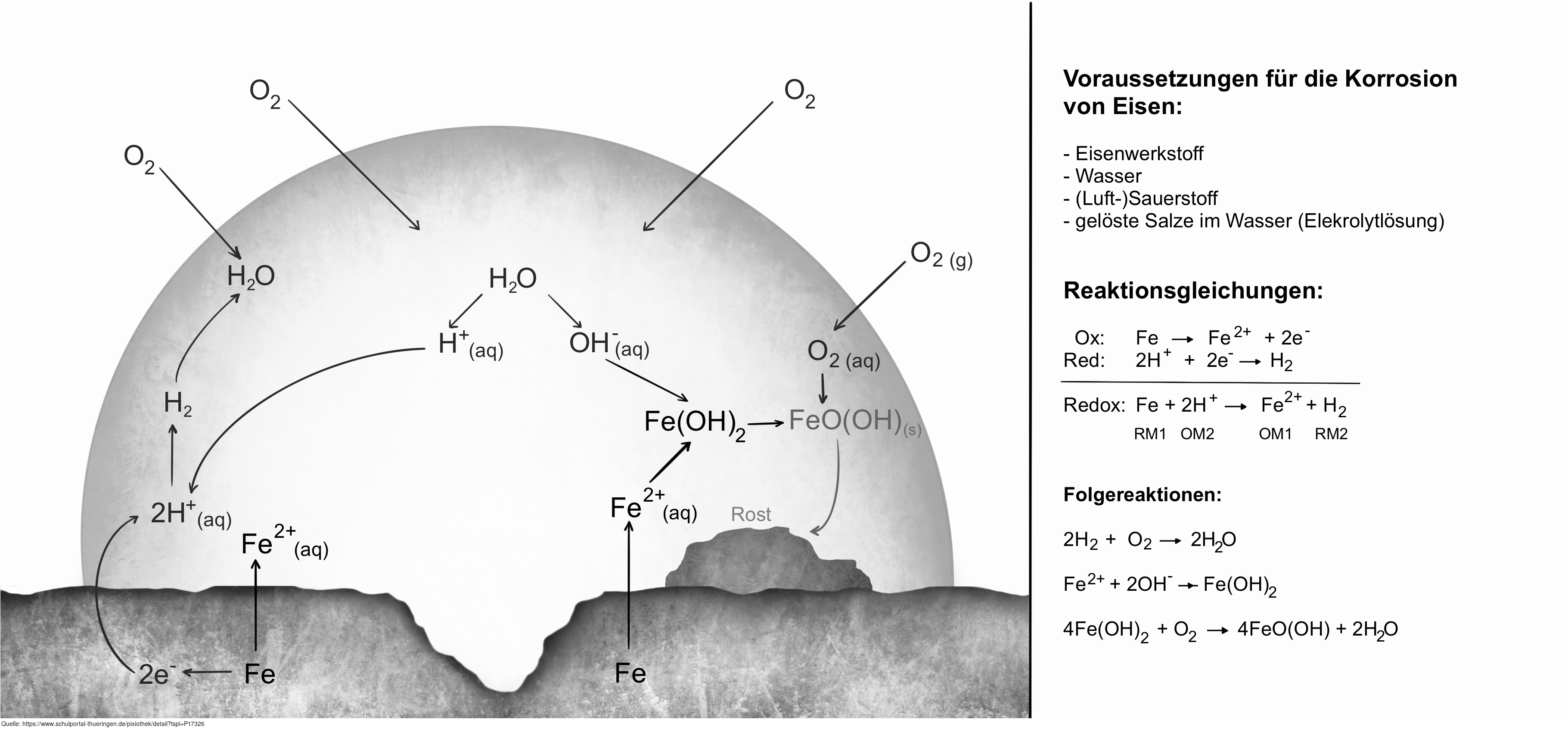 Das Bild gehört zur Serie „Korrosion und Korrosionsschutz“. Es verdeutlicht den Prozess der Säurekorrosion an einem Eisenwerkstoff. Bild-Variante: s/w, beschriftet, mit Erläuterung. Es gelten die Nutzungsbedingungen der Mediothek und Pixiothek.