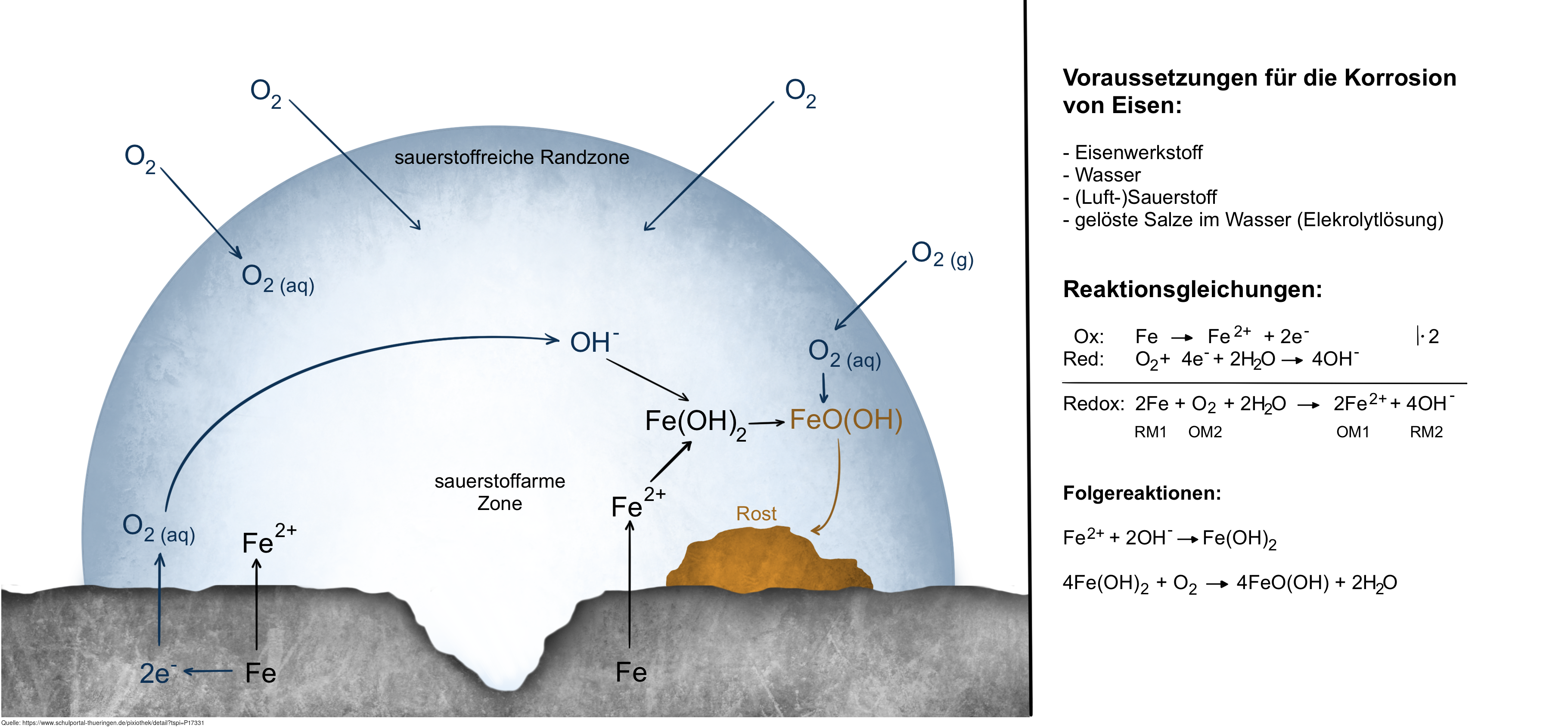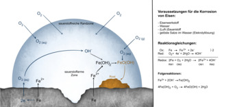 Das Bild gehört zur Serie „Korrosion und Korrosionsschutz“. Es verdeutlicht den Prozess der Sauerstoffkorrosion an einem Eisenwerkstoff. Bild-Variante: farbig, beschriftet, mit Erläuterung. Es gelten die Nutzungsbedingungen der Mediothek und Pixiothek.