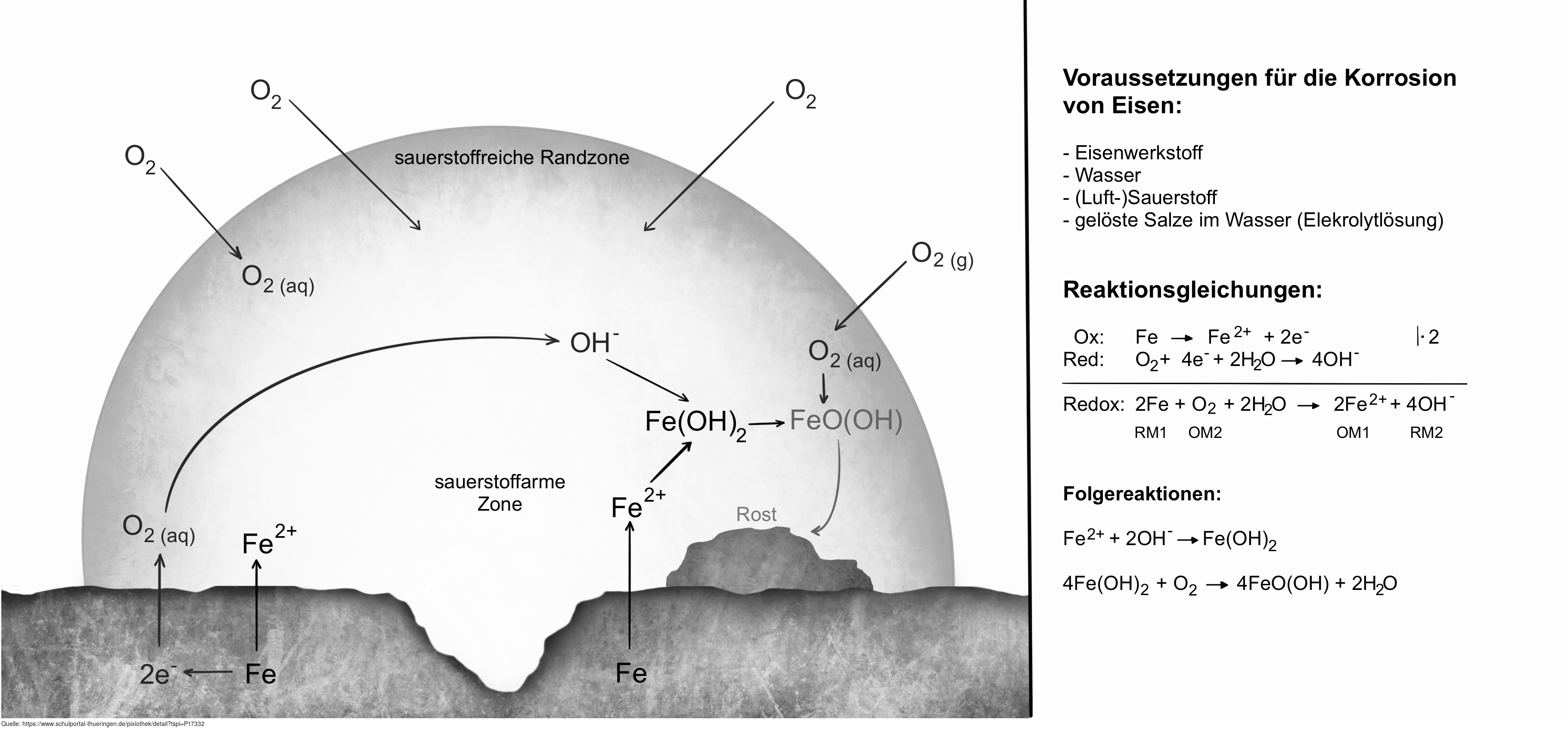 Das Bild gehört zur Serie „Korrosion und Korrosionsschutz“. Es verdeutlicht den Prozess der Sauerstoffkorrosion an einem Eisenwerkstoff. Bild-Variante: s/w, beschriftet, mit Erläuterung. Es gelten die Nutzungsbedingungen der Mediothek und Pixiothek.