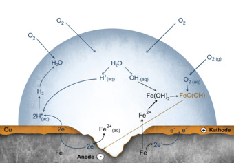Das Bild gehört zur Serie „Korrosion und Korrosionsschutz“. Es verdeutlicht den Korrosionsschutz eines Eisenwerkstoffes mit Hilfe eines edlen Metalls. Bild-Variante: farbig, beschriftet, ohne Erläuterung. Es gelten die Nutzungsbedingungen der Mediothek und Pixiothek.