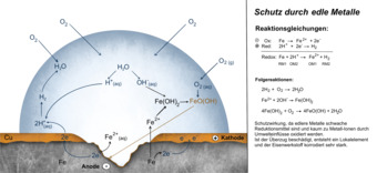 Das Bild gehört zur Serie „Korrosion und Korrosionsschutz“. Es verdeutlicht den Korrosionsschutz eines Eisenwerkstoffes mit Hilfe eines edlen Metalls. Bild-Variante: farbig, beschriftet, mit Erläuterung. Es gelten die Nutzungsbedingungen der Mediothek und Pixiothek.