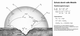 Das Bild gehört zur Serie „Korrosion und Korrosionsschutz“. Es verdeutlicht den Korrosionsschutz eines Eisenwerkstoffes mit Hilfe eines edlen Metalls. Bild-Variante: s/w, beschriftet, mit Erläuterung. Es gelten die Nutzungsbedingungen der Mediothek und Pixiothek.
