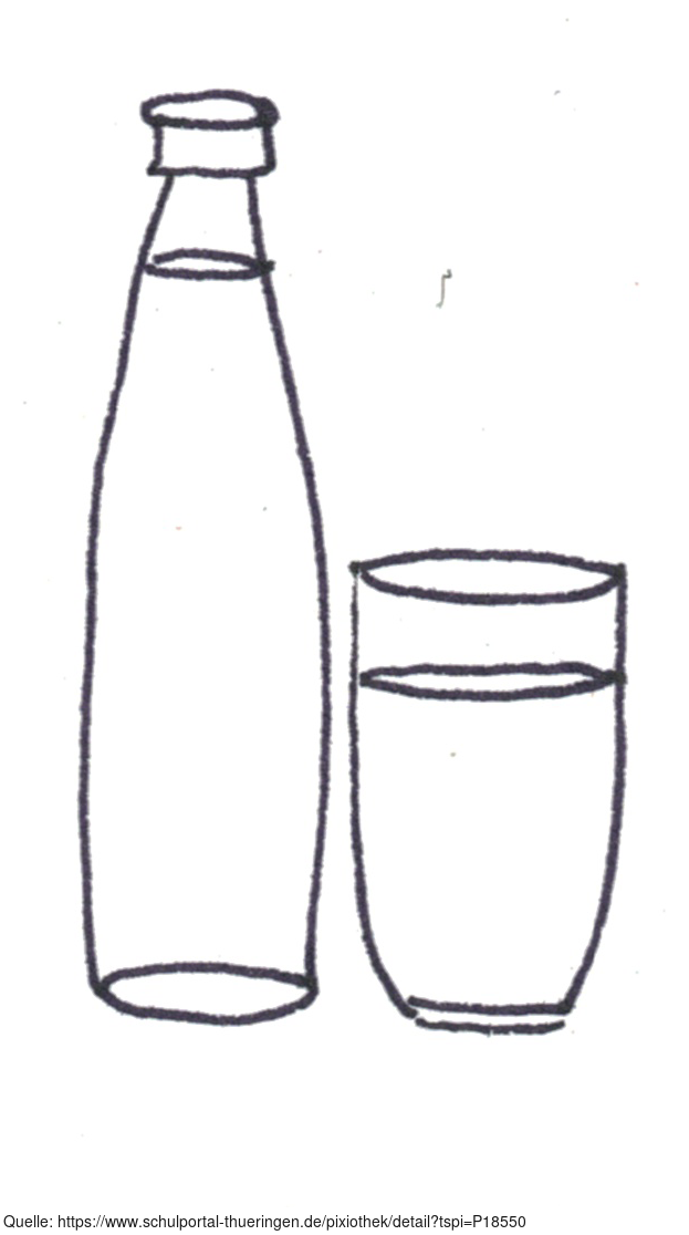 Das Bild zeigt eine gezeichnete Flasche und ein Glas mit Wasser (s/w). Es gehört zur Serie "Ernährungspyramide zum Basteln und Gestalten" und findet u.a. im gleichnamigen Lernobjekt unter https://www.schulportal-thueringen.de/web/guest/media/detail?tspi=18517 Verwendung. Es gelten die Nutzungsbedingungen der Mediothek und Pixiothek.