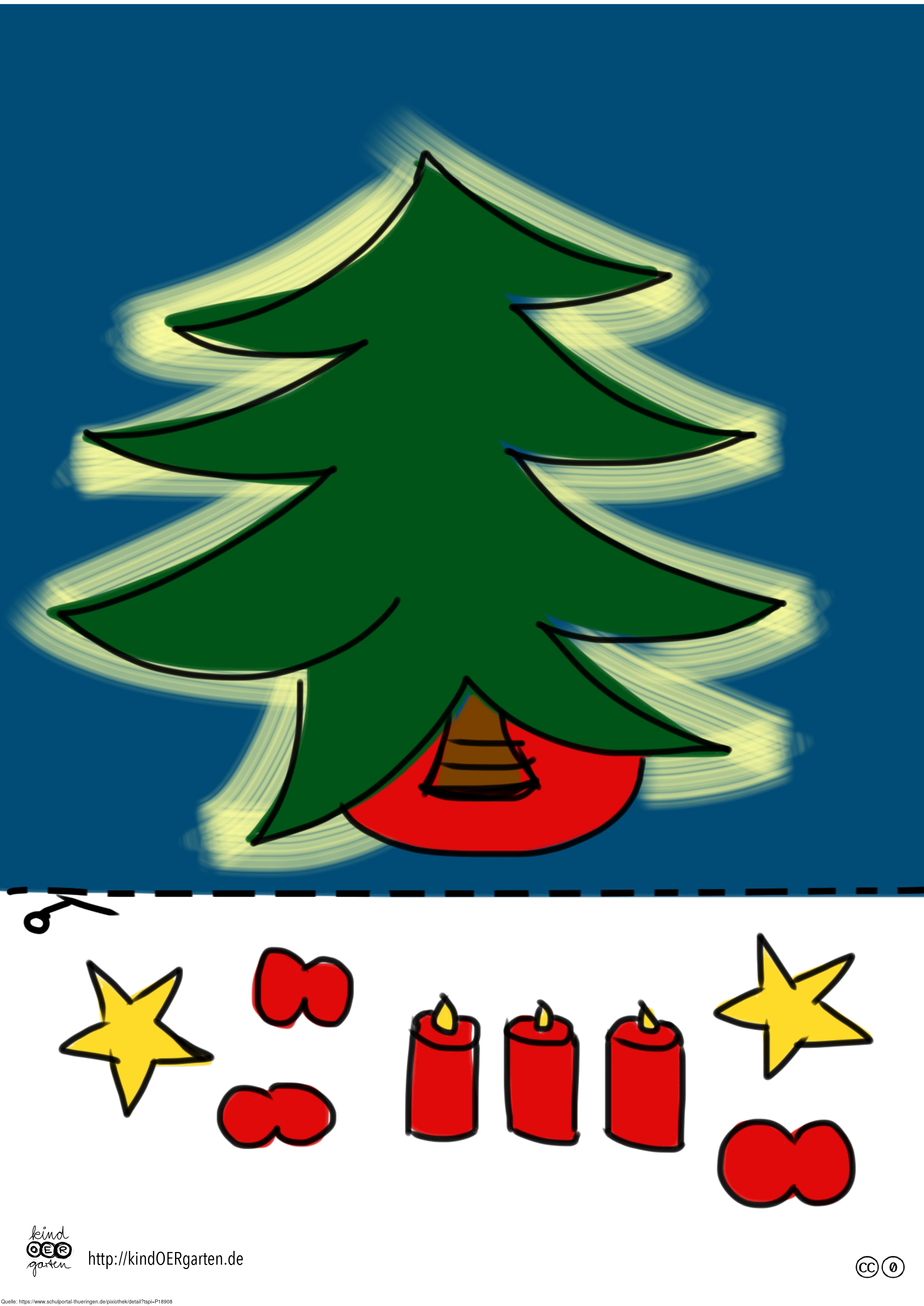 Das Bild zeigt einen Weihnachtsbaum (farbig) und kann als Schnipselbildvorlage für Kinder im Kindergarten bzw. Elementarbereich dienen. Das Bild ist unter CC0 lizenziert und kann somit frei verwendet werden. Es ist neben weiteren Bildern auch hier zu finden: https://kindoergarten.wordpress.com/