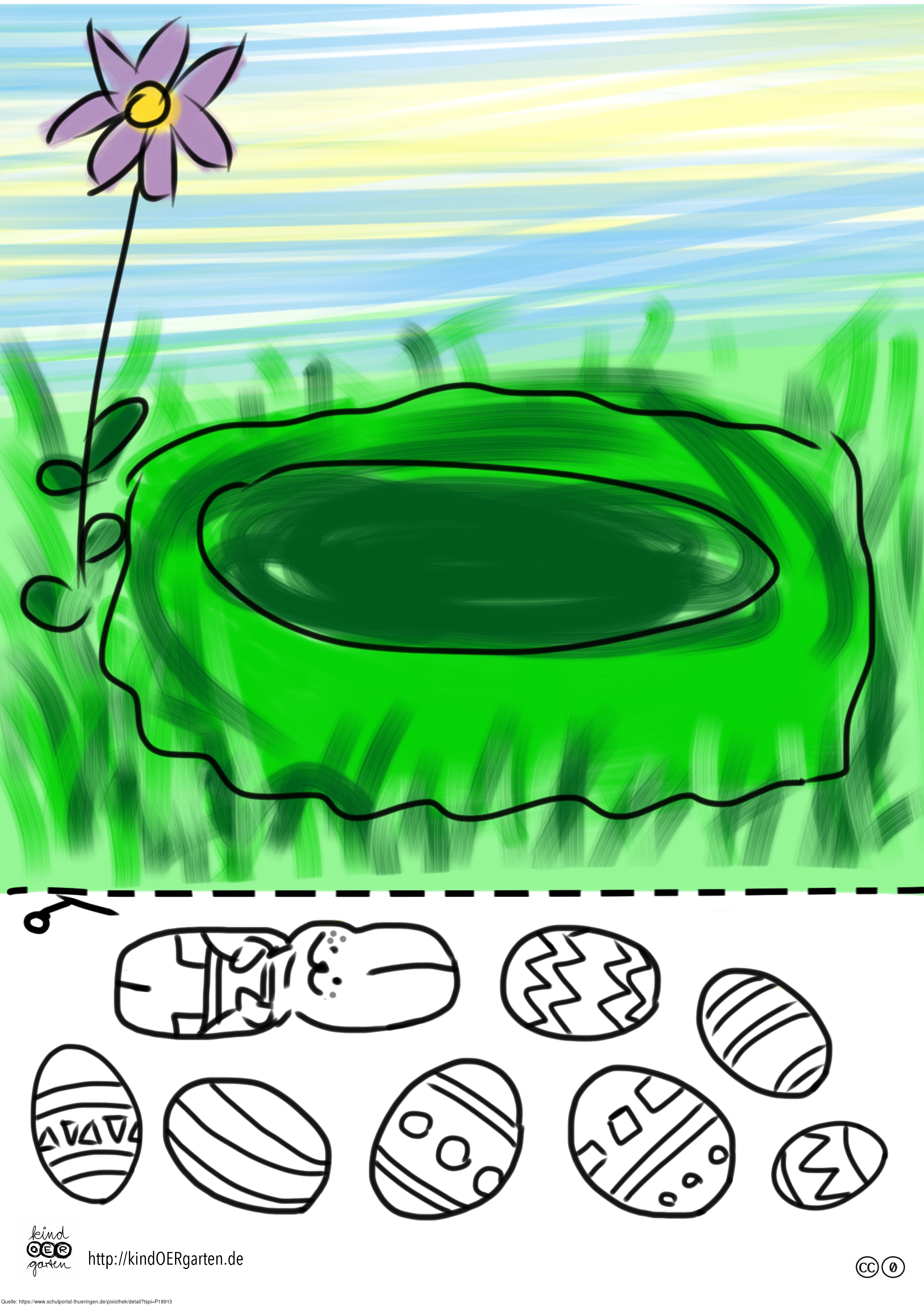 Das Bild zeigt eine Osternest (Nest farbig, Ostereier s/w) und kann als Schnipselbildvorlage für Kinder im Kindergarten bzw. Elementarbereich dienen. Das Bild ist unter CC0 lizenziert und kann somit frei verwendet werden. Es ist neben weiteren Bildern auch hier zu finden: https://kindoergarten.wordpress.com/