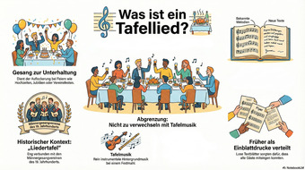 Die Infografik "Was ist ein Tafellied?" wurde mit Hilfe der KI NotebookLM erstellt und verdeutlicht die wichtigsten Merkmale dieser Text- bzw. Liedgattung. Es gelten die Nutzungsbedingungen der Mediothek und Pixiothek.