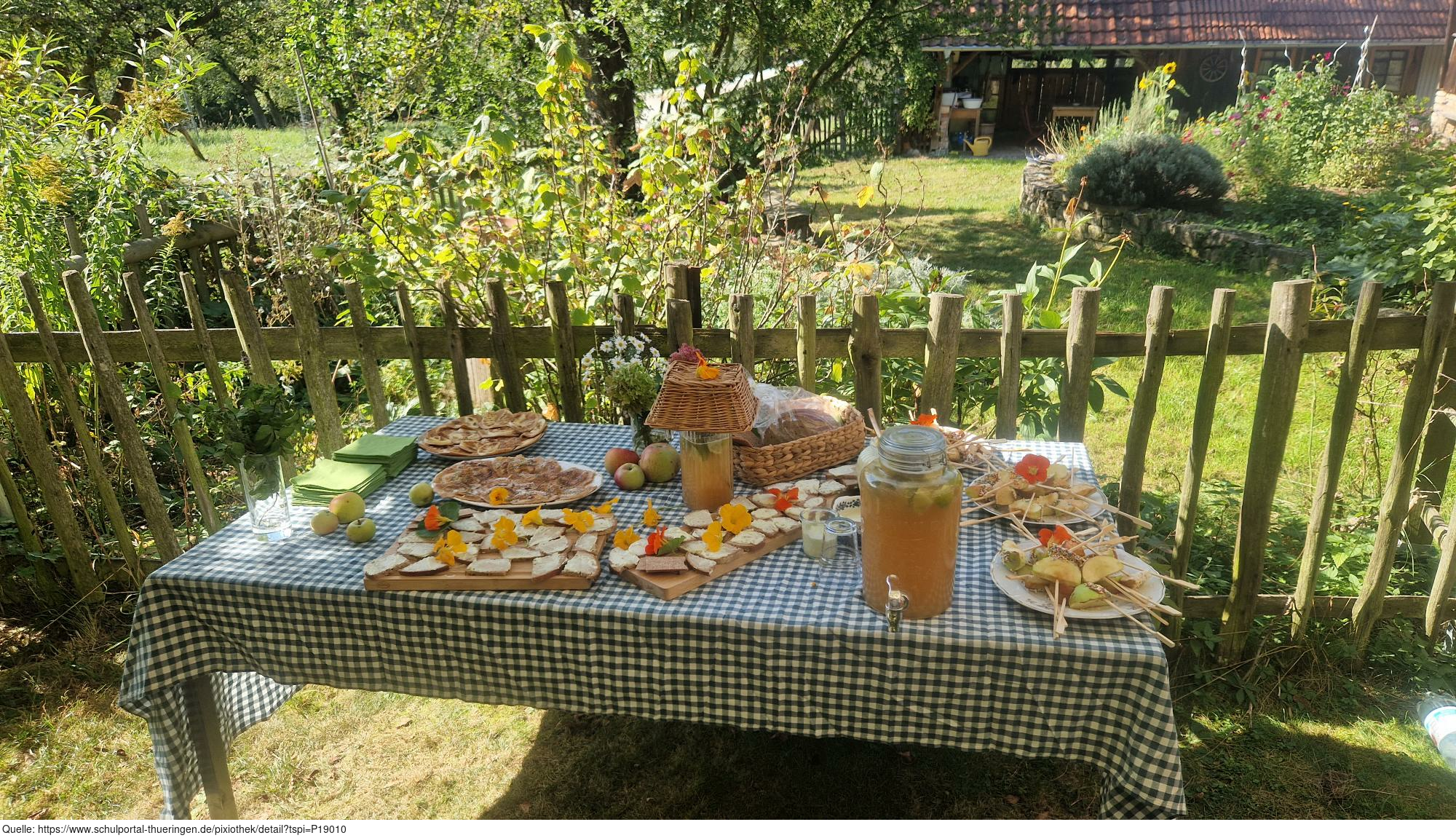 Das Bild zeigt eine Ansicht auf dem ApfelGut Erfurt. Auf einem Tisch mit einer blau-weiß karierten Tischdecke stehen Gläser, Karaffen und Äpfel bereit. Im Hintergrund befindet sich ein Holzzaun, der das Areal begrenzt. Es gelten die Nutzungsbedingungen der Mediothek und Pixiothek.