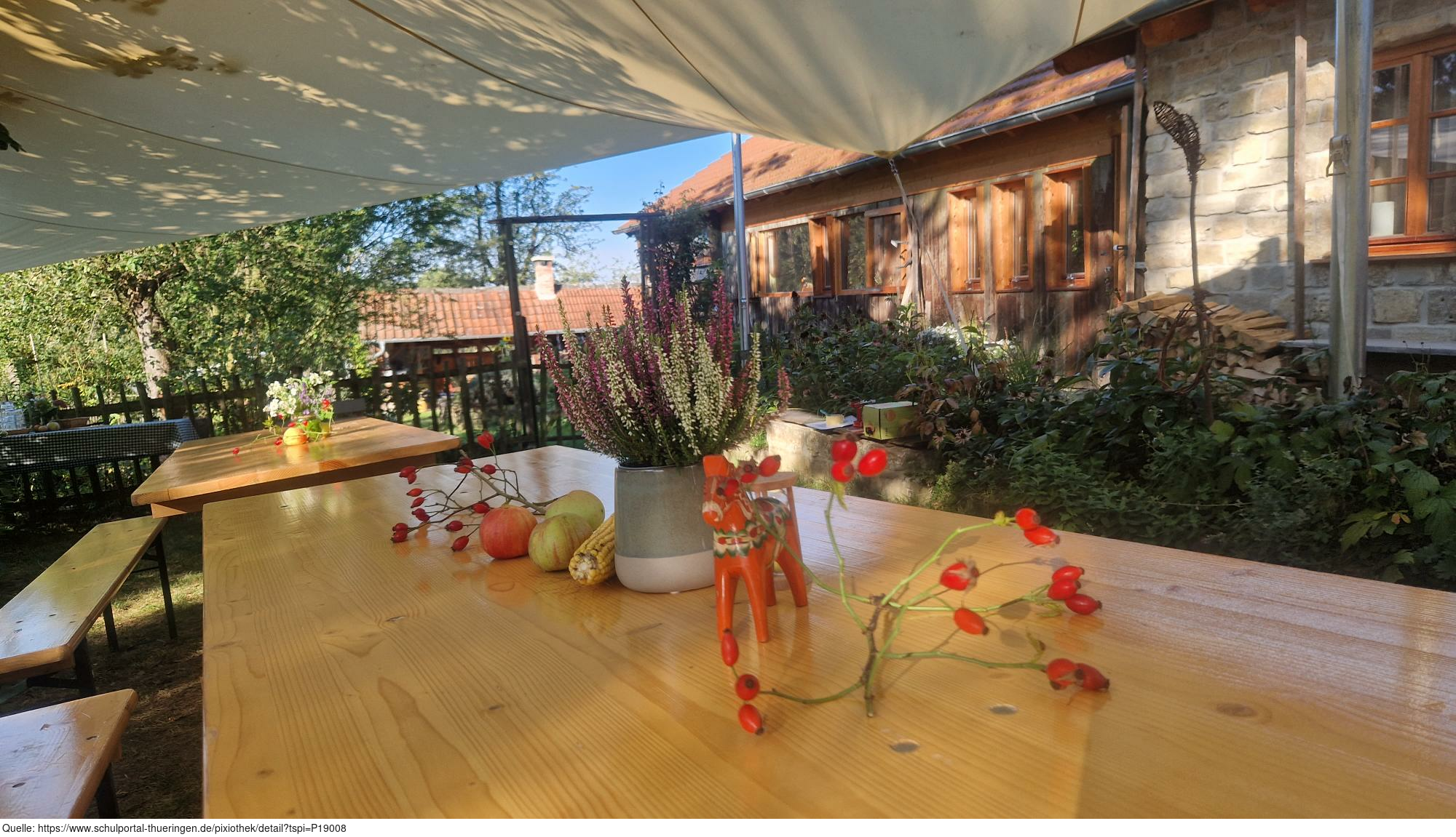 Das Bild zeigt einen mit Äpfeln und Pflanzen dekorierten Tisch auf dem ApfelGut Erfurt. Es gelten die Nutzungsbedingungen der Mediothek und Pixiothek.