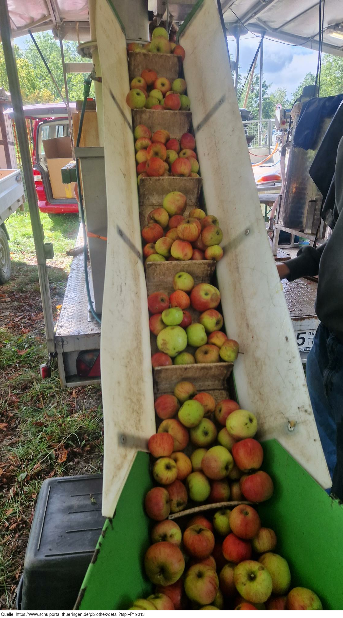 Das Bild zeigt eine mobile Mosterei auf dem ApfelGut Erfurt. Das Bild zeigt eine mobile Mosterei, in der Äpfel für die Herstellung von Saft verarbeitet werden. Die Äpfel werden auf einem Förderband transportiert und anschließend gepresst. Es gelten die Nutzungsbedingungen der Mediothek und Pixiothek.