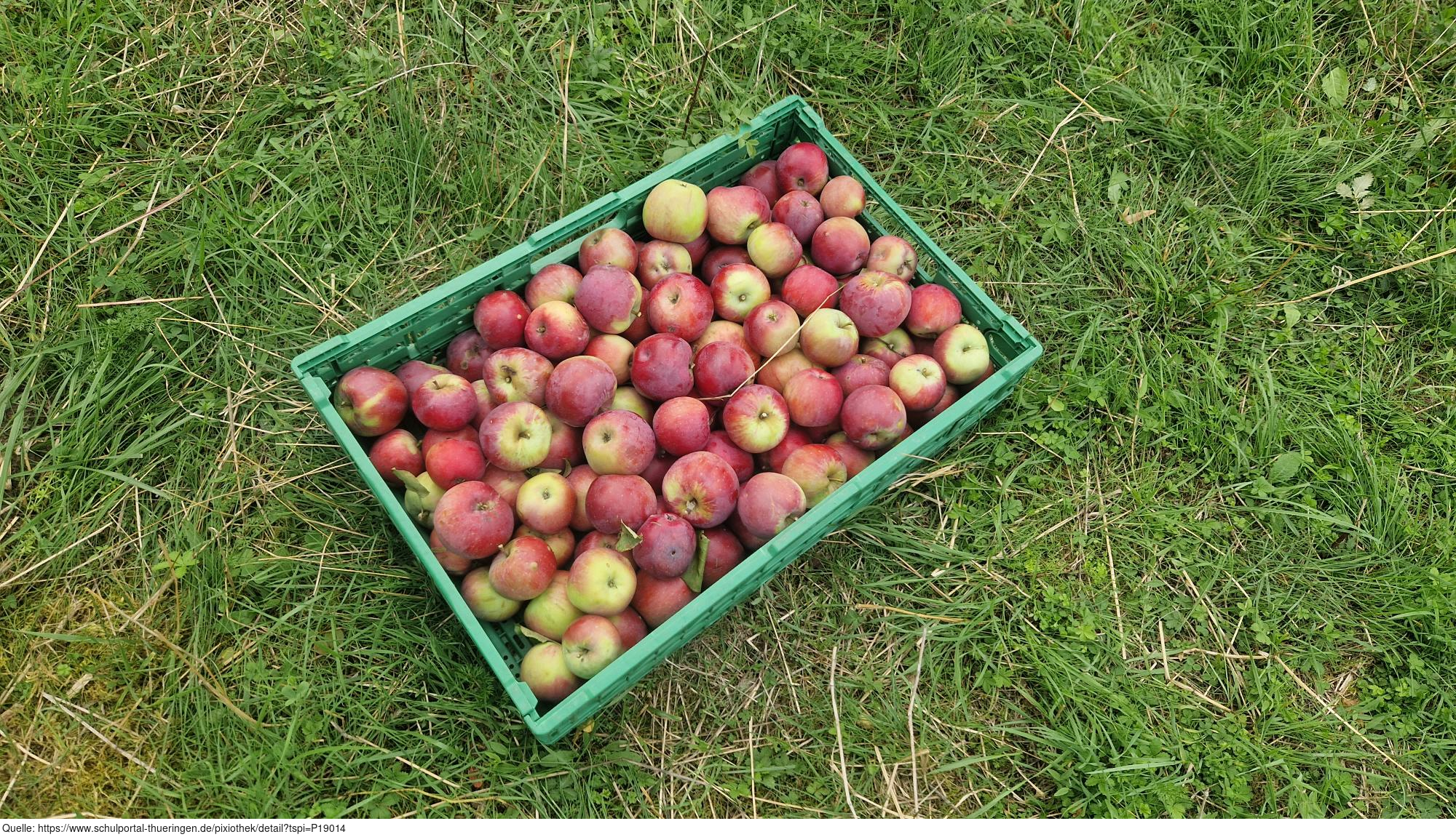 Das Bild zeigt eine Obstkiste mit Äpfeln auf dem ApfelGut Erfurt. Es gelten die Nutzungsbedingungen der Mediothek und Pixiothek.