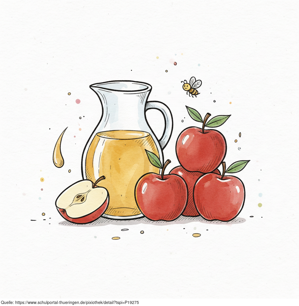 Das Bild zeigt gezeichnete Motive zum Begriff Apfelsaft. Das Bild wurde mittels einer KI (Gemini) erstellt und ist unter CC0 lizenziert. Weitere Bilder aus Herrn Emrich-Försters Bild-Archiv findet man hier: https://pix.foerster.rocks/