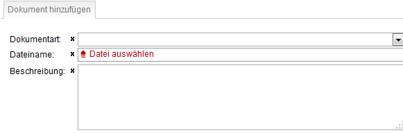 Dokumentart, Dateiname und Beschreibung sind Pflichtfelder, wobei die Dokumentart aus einem Drop-Down-Menü gewählt werden kann.