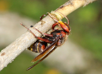 Das Foto gehört zur Serie "Hornissen". Es zeigt eine junge Hornissenkönigin (Vespa crabro). Für die eigene Ernährung nutzen Hornissen zuckerhaltige Säfte und Flüssigkeiten, besonders gern Baumsäfte an Rindenverletzungen. Es gelten die Nutzungsbedingungen der Mediothek und Pixiothek.