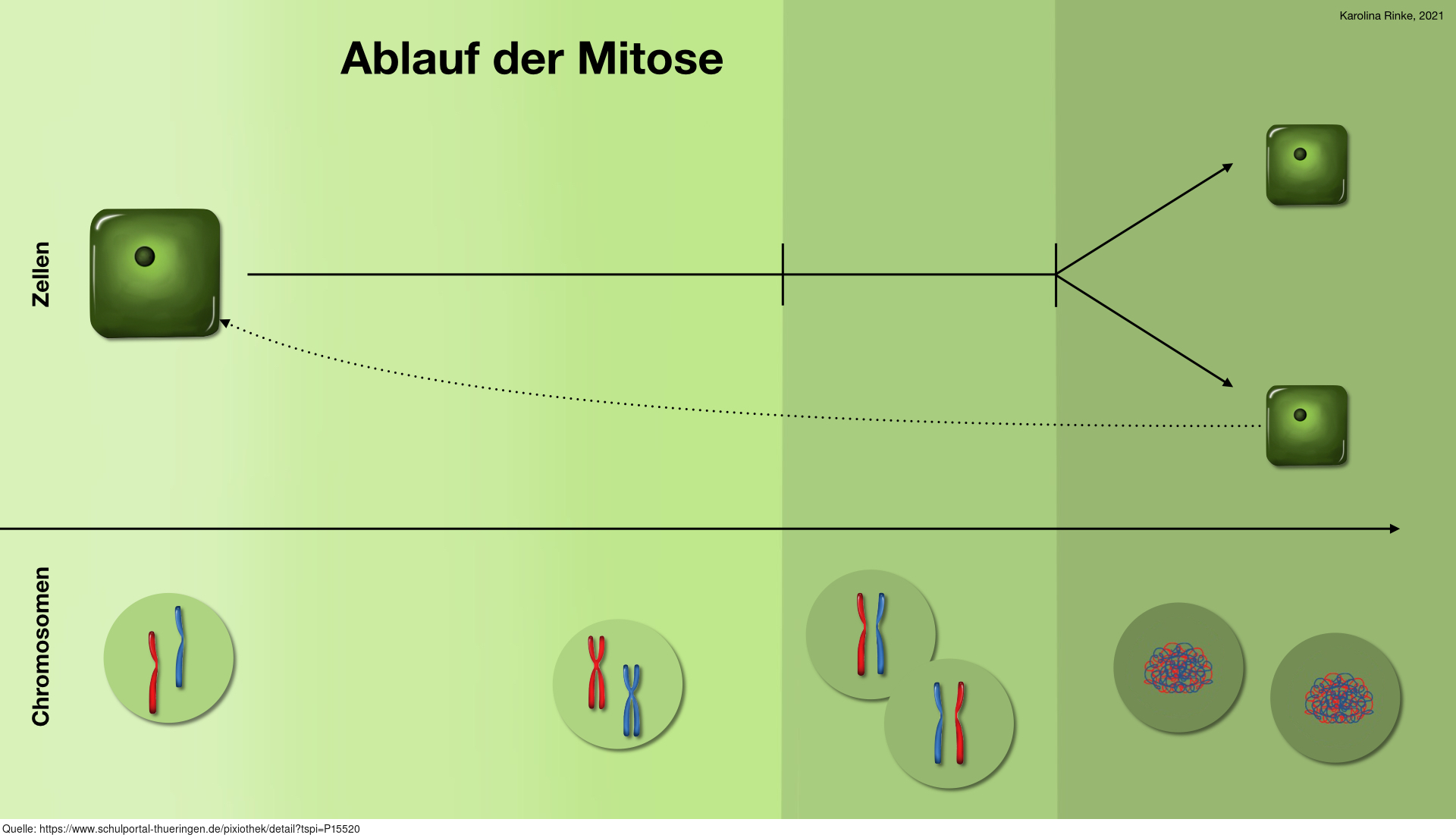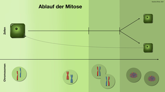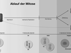 Das Bild gehört zur Serie "Mitose und Meiose" und verdeutlicht die Mitose in einer Übersichtsdarstellung. Variante: farbig; unbeschriftet; farbiger Hintergrund. Es gelten die Nutzungsbedingungen der Mediothek und Pixiothek.