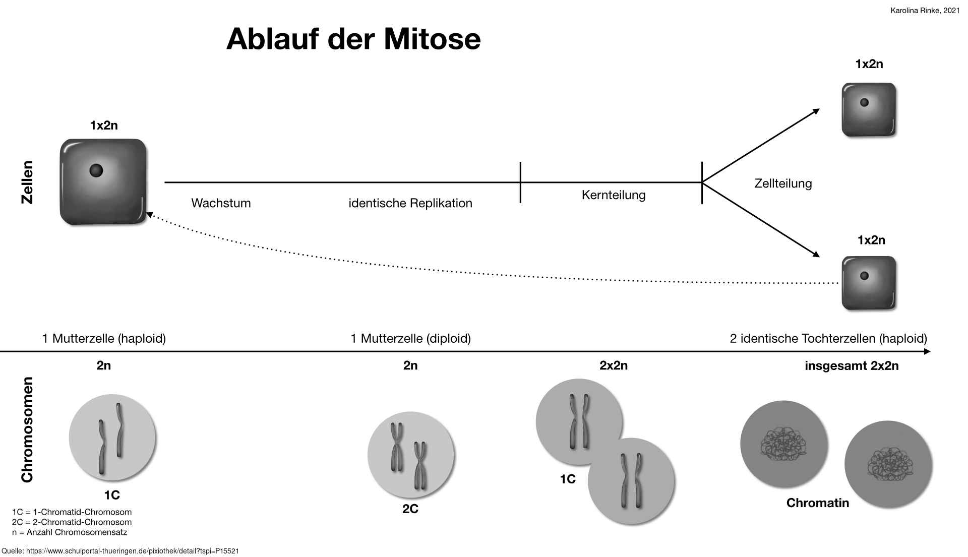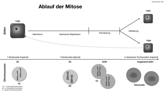 Das Bild gehört zur Serie "Mitose und Meiose" und verdeutlicht die Mitose in einer Übersichtsdarstellung. Variante: s/w; beschriftet; weißer Hintergrund. Es gelten die Nutzungsbedingungen der Mediothek und Pixiothek.