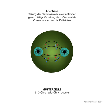 Das Bild gehört zur Serie "Mitose und Meiose" und verdeutlicht den Ablauf der Mitose, hier die Anaphase. Variante: farbig. Es gelten die Nutzungsbedingungen der Mediothek und Pixiothek.