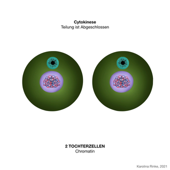 Das Bild gehört zur Serie "Mitose und Meiose" und verdeutlicht den Ablauf der Mitose, hier die Cytokinese. Variante: farbig. Es gelten die Nutzungsbedingungen der Mediothek und Pixiothek.