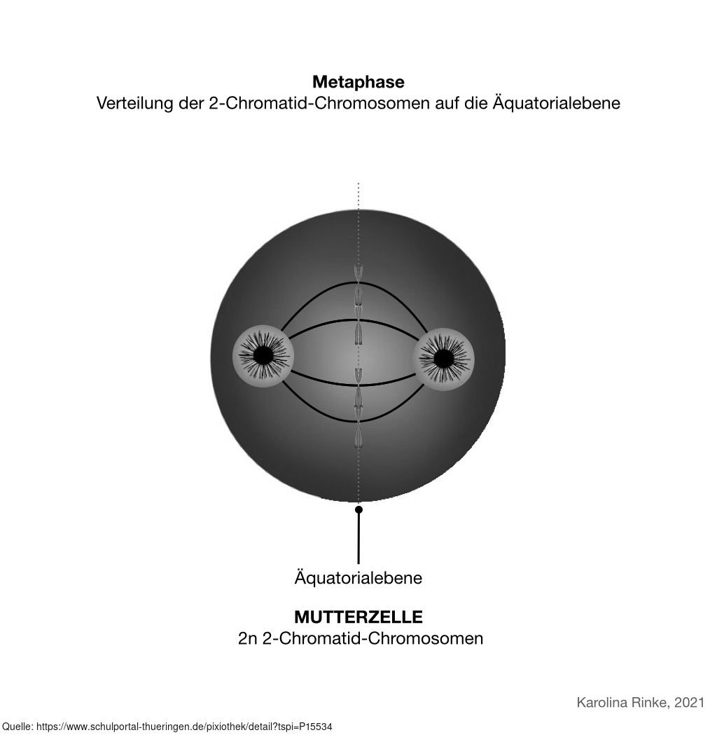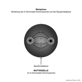 Das Bild gehört zur Serie "Mitose und Meiose" und verdeutlicht den Ablauf der Mitose, hier die Metaphase 2. Variante: s/w. Es gelten die Nutzungsbedingungen der Mediothek und Pixiothek.
