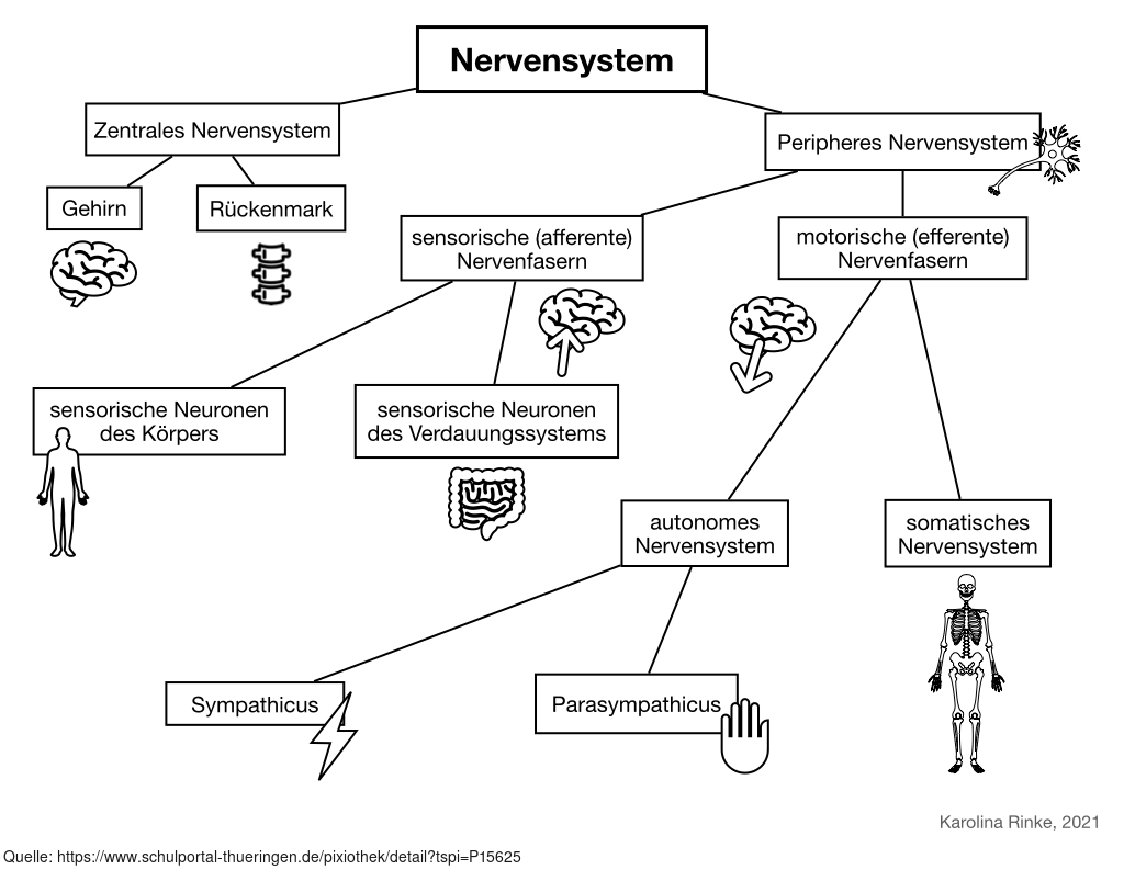 Das Bild verdeutlicht in einer Übersicht das Nervensystem. Variante: s/w; beschriftet; bebildert; weißer Hintergrund. Es gelten die Nutzungsbedingungen der Mediothek und Pixiothek.