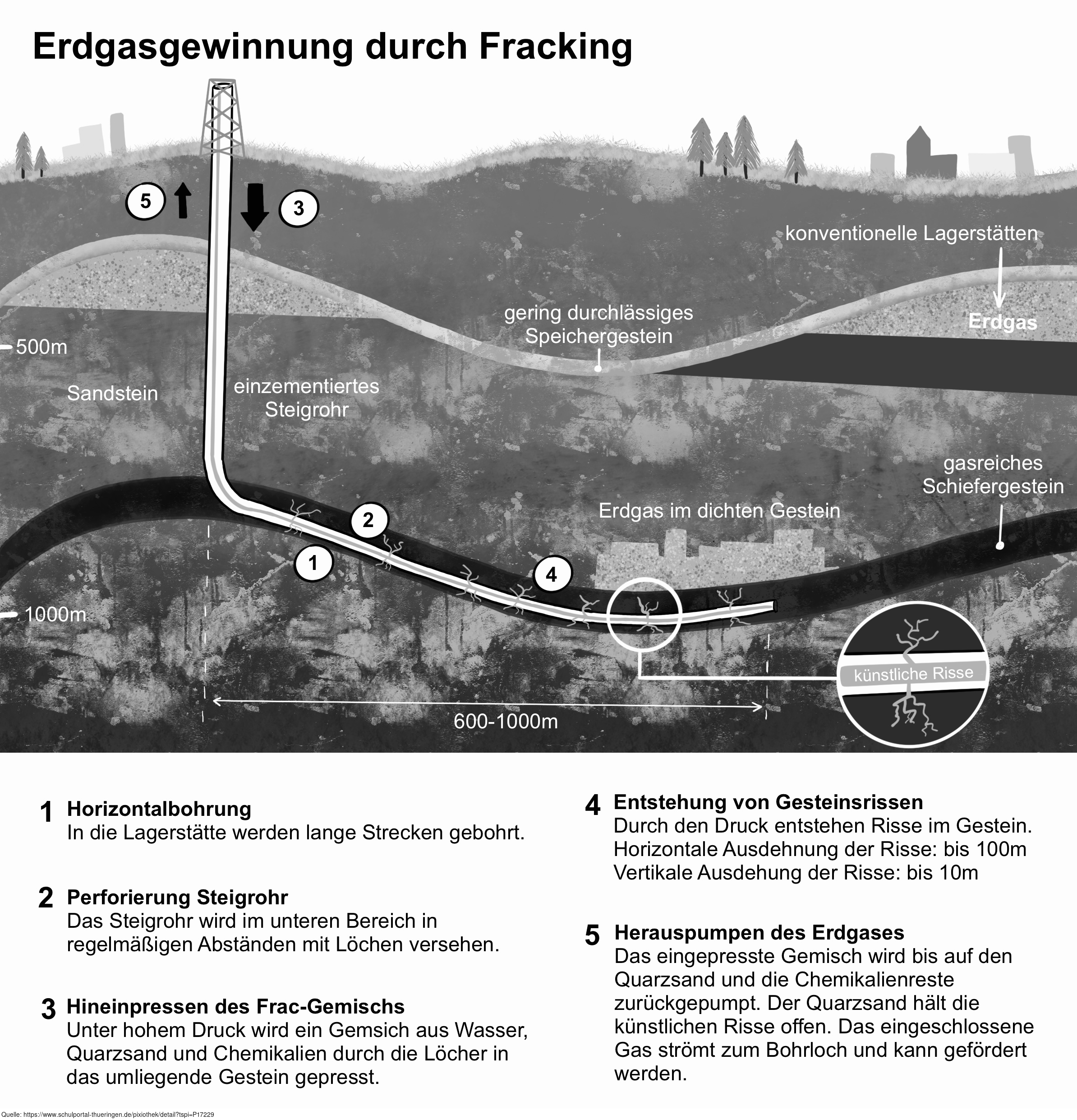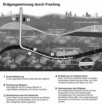 Das Bild zeigt, wie Erdöl und Erdgas mittels Fracking aus der Erdkruste gewonnen werden. Variante: s/w; mit Text. Es gelten die Nutzungsbedingungen der Mediothek und Pixiothek.