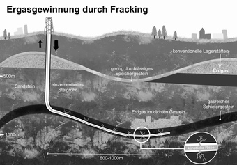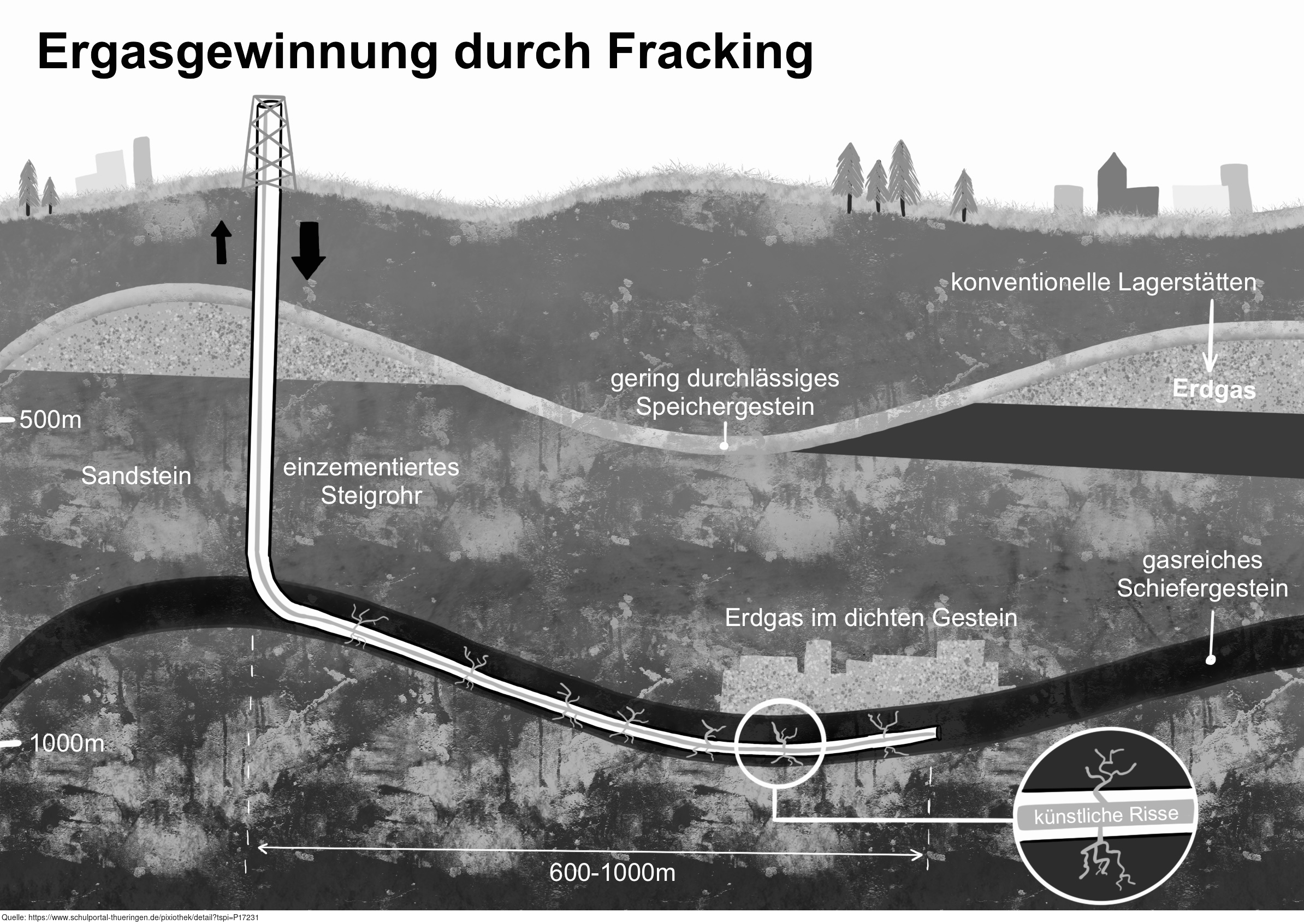 Das Bild zeigt, wie Erdöl und Erdgas mittels Fracking aus der Erdkruste gewonnen werden. Variante: s/w; beschriftet. Es gelten die Nutzungsbedingungen der Mediothek und Pixiothek.