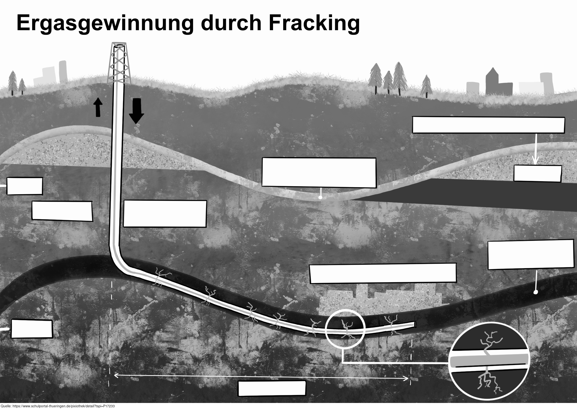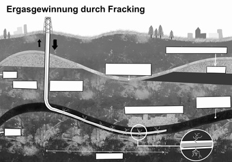 Das Bild zeigt, wie Erdöl und Erdgas mittels Fracking aus der Erdkruste gewonnen werden. Variante: s/w; unbeschriftet. Es gelten die Nutzungsbedingungen der Mediothek und Pixiothek.