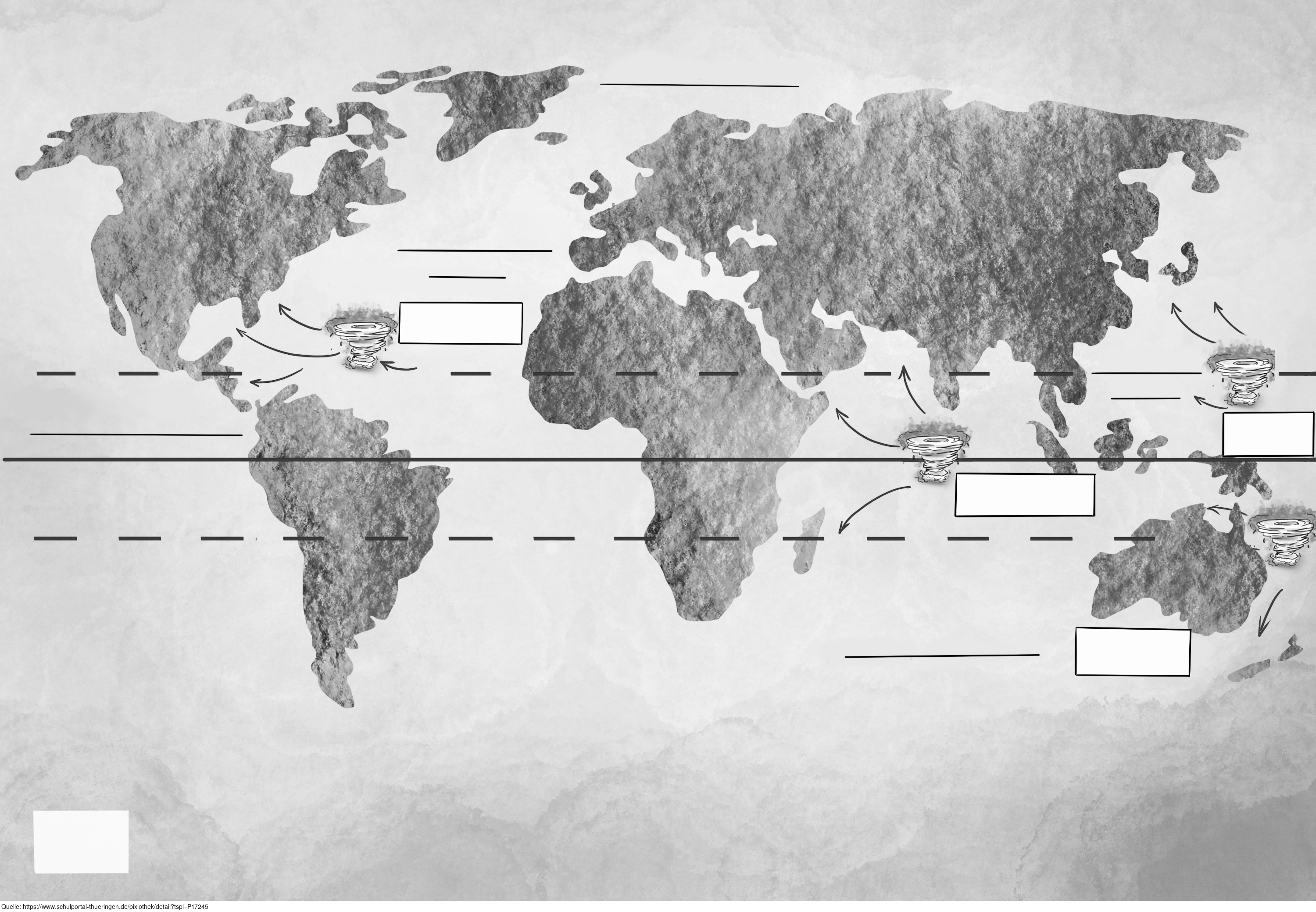 Das Bild verdeutlicht, zu welcher Saison bestimmte Regionen der Erde anfällig für tropische Wirbelstürme sind und wie diese je nach Region bezeichnet werden. Variante: farbig; unbeschriftet. Es gelten die Nutzungsbedingungen der Mediothek und Pixiothek.