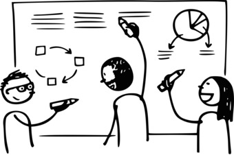 Die Zeichnung zeigt eine symbolhafte Szene zur Darstellung von Kollaboration bzw. Zusammenarbeit. Das Bild ist unter CC0 lizenziert und kann somit frei verwendet werden. Es ist neben weiteren Bildern auch hier zu finden: https://cocomaterial.com