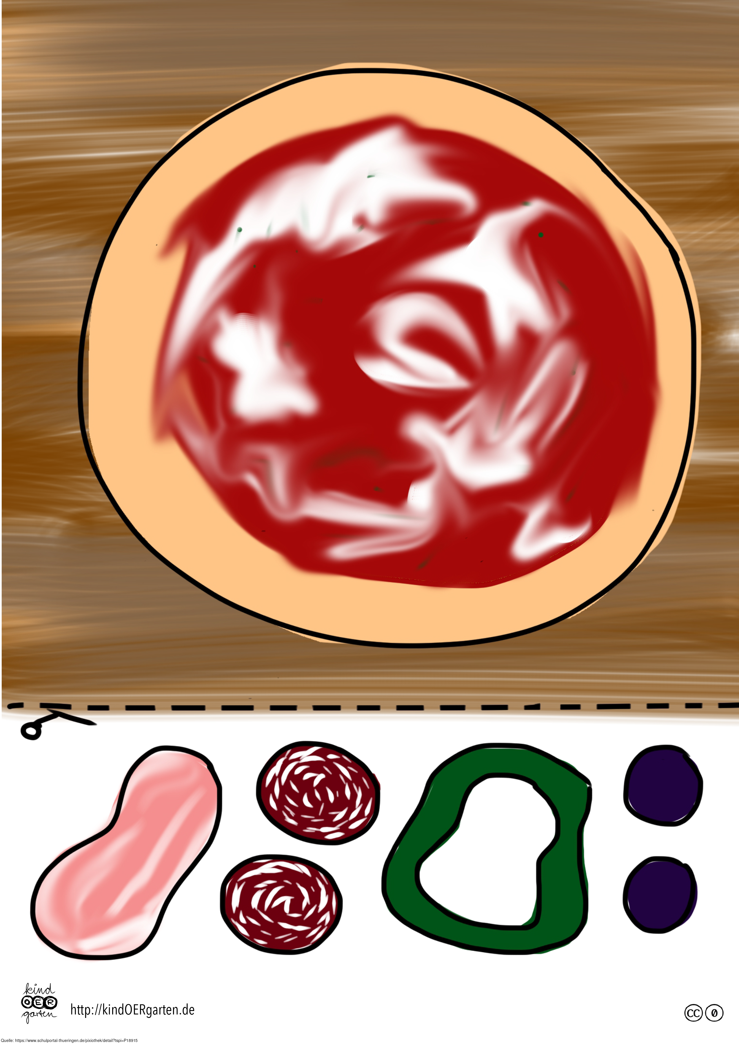Das Bild zeigt eine Pizza (farbig) und kann als Schnipselbildvorlage für Kinder im Kindergarten bzw. Elementarbereich dienen. Das Bild ist unter CC0 lizenziert und kann somit frei verwendet werden. Es ist neben weiteren Bildern auch hier zu finden: https://kindoergarten.wordpress.com/