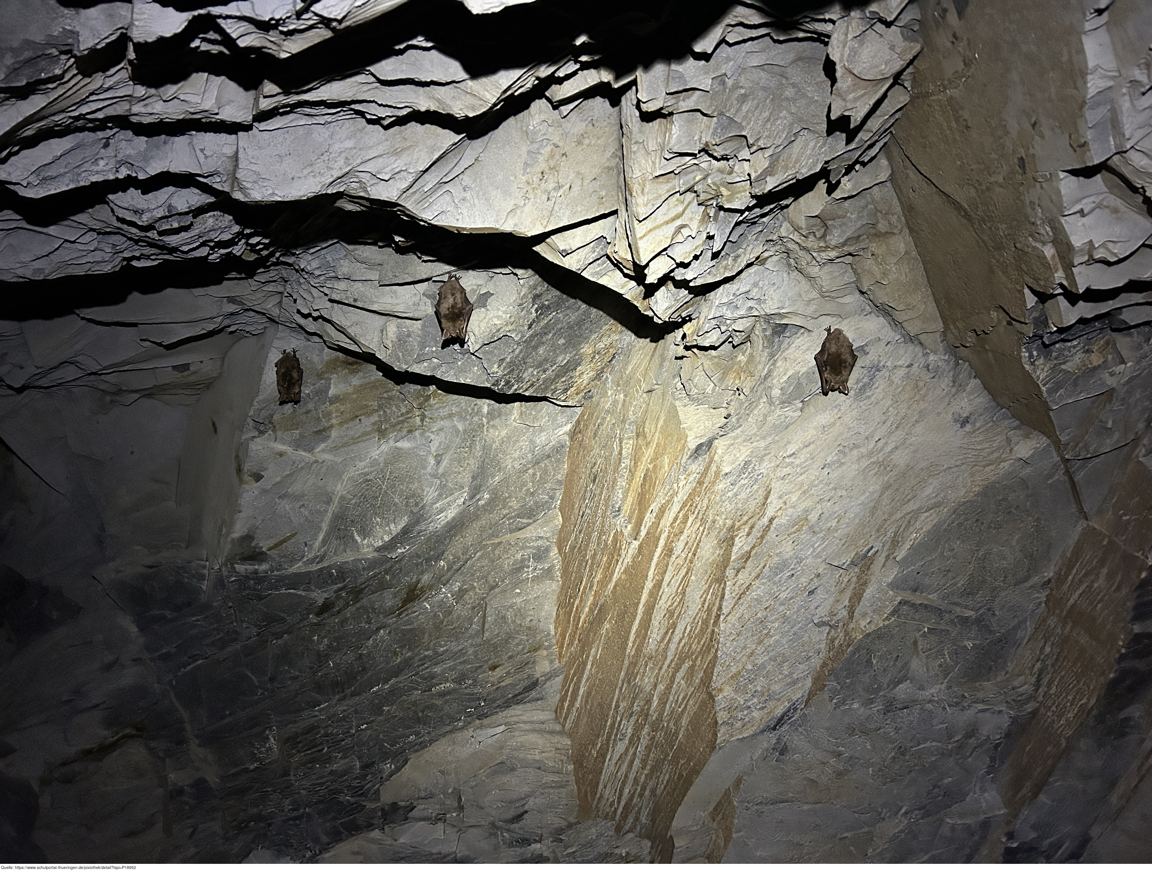 Das Bild zeigt Kleine Hufeisennasen (Fledermausart) in einem Schieferstollen. Es gelten die Nutzungsbedingungen der Mediothek und Pixiothek.