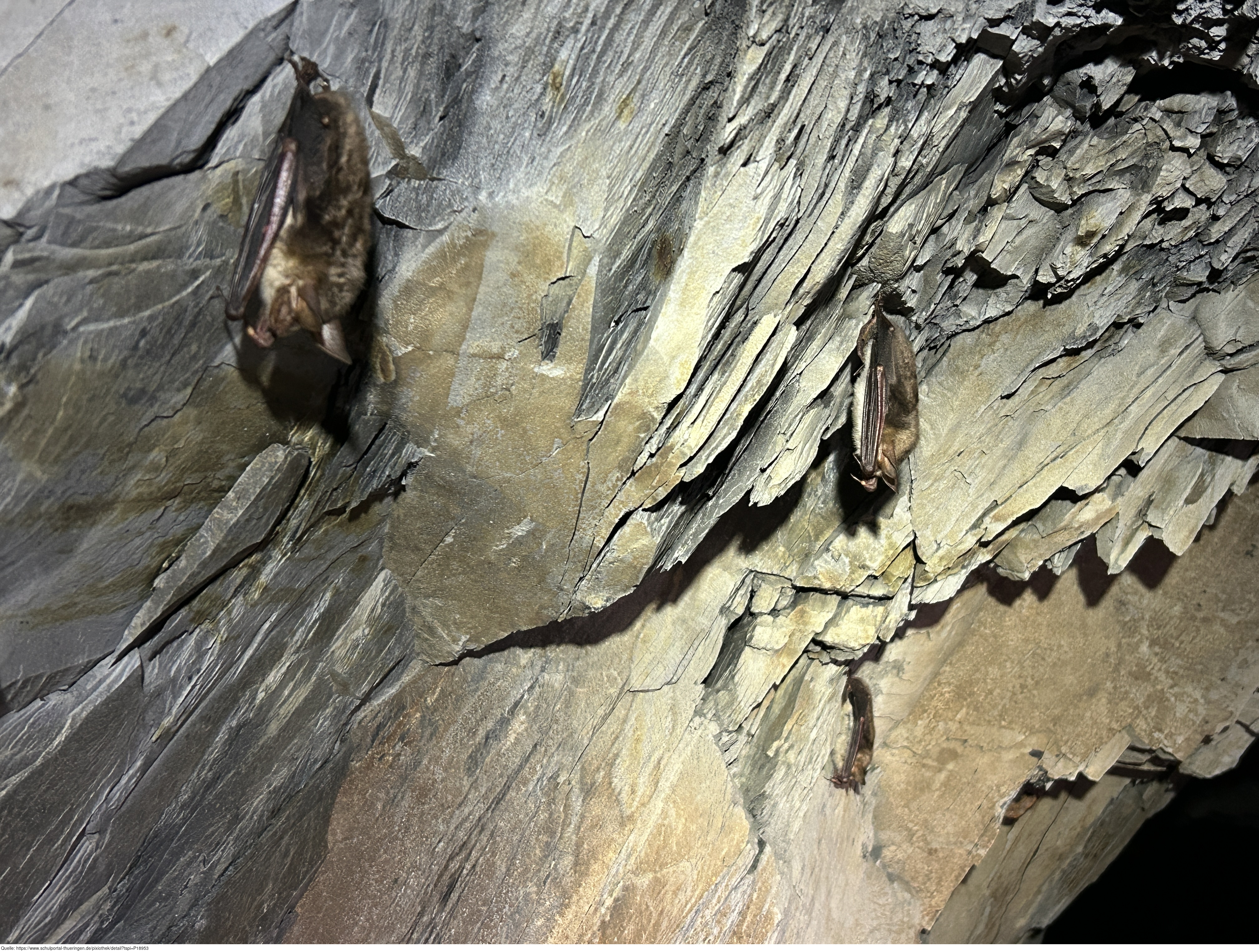 Das Bild zeigt Große Mausohren(Fledermausart) in einem Schieferstollen. Es gelten die Nutzungsbedingungen der Mediothek und Pixiothek.