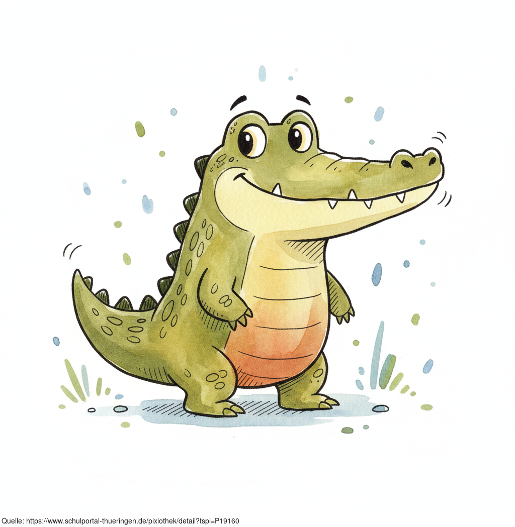 Das Bild zeigt einen gezeichneten Alligator. Das Bild wurde mittels einer KI (Gemini) erstellt und ist unter CC0 lizenziert. Weitere Bilder aus Herrn Emrich-Försters Bild-Archiv findet man hier: https://pix.foerster.rocks/