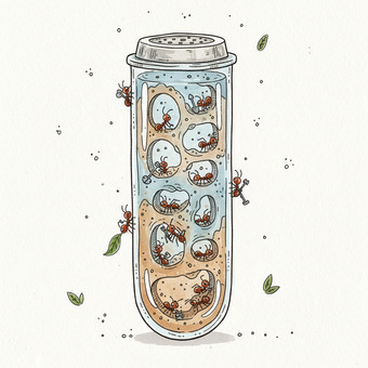 Das Bild zeigt eine gezeichnete Armeisenfarm. Das Bild wurde mittels einer KI (Gemini) erstellt und ist unter CC0 lizenziert. Weitere Bilder aus Herrn Emrich-Försters Bild-Archiv findet man hier: https://pix.foerster.rocks/