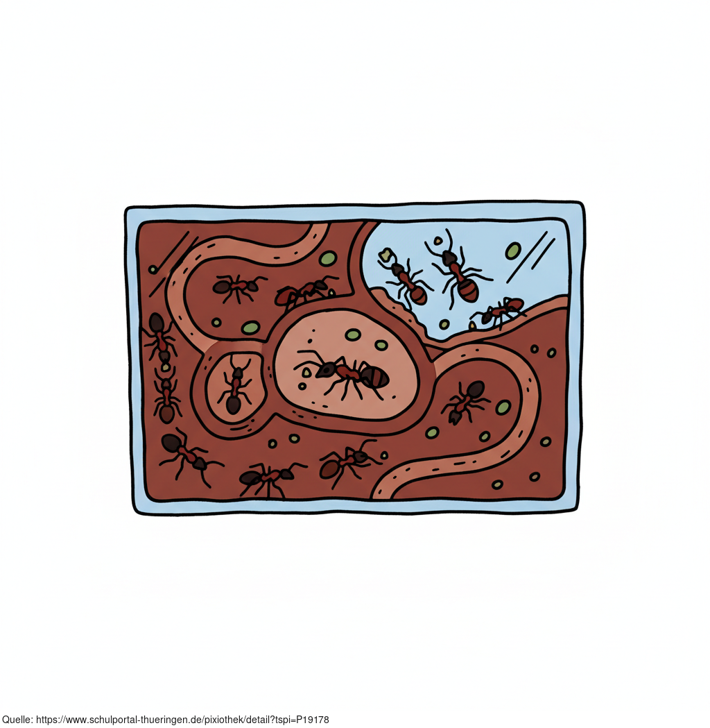 Das Bild zeigt eine gezeichnete Armeisenfarm. Das Bild wurde mittels einer KI (Gemini) erstellt und ist unter CC0 lizenziert. Weitere Bilder aus Herrn Emrich-Försters Bild-Archiv findet man hier: https://pix.foerster.rocks/