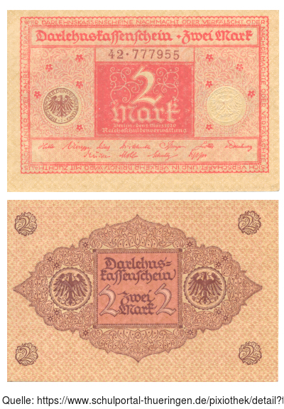 Das Foto gehört zur Serie "Zahlungsmittel in der Weimarer Republik (1918-1933)". Es zeigt einen Darlehenskassenschein über "Zwei Mark" der Reichsschuldenverwaltung Berlin vom 01. März 1920 . Es gelten die Nutzungsbedingungen der Mediothek und Pixiothek.