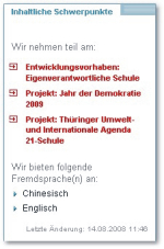 Unter inhaltlichen Schwerpunkten werden verschiedene Entwicklungsvorhaben, u.a.  "Eigenverantwortliche Schule" sowie Teilnahmen an landesweiten Schulversuchen und Projekten verstanden. Darüber hinaus können optional Angaben zu den angebotenen Fremdsprachen gemacht werden.