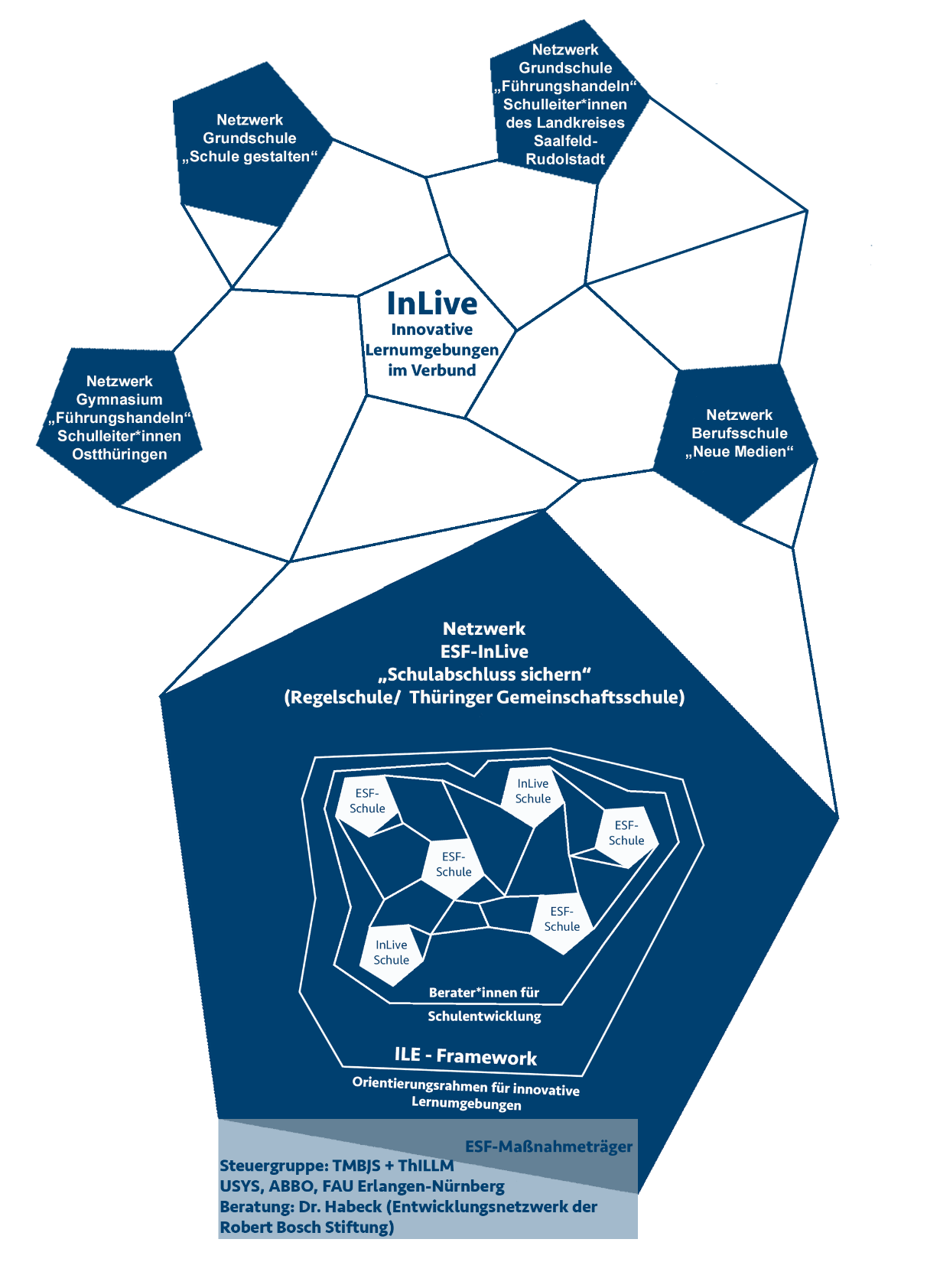 Das ESF-InLiVe-Netzwerk "Schulabschluss sichern" stellt eines von fünf InLiVe-Netzwerken in Thüringen dar (siehe Abbildung oben). "InLiVe" steht für "Innovative Lernumgebungen im Verbund" und bedeutet, international anerkannte Kriterien zur Gestaltung von innovativen Lernumgebungen des Centre for Educational Research and Innovation (CERI) der OECD aufzugreifen.
