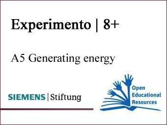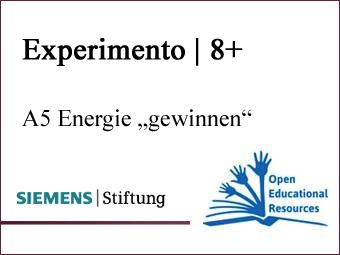 Das Medienpaket enthält die Anleitungen zum Experiment „A5 Energie gewinnen“ für die Lehrkraft und für Schülerinnen und Schüler im Alter zwischen 8 und 12 Jahren. Die Materialien sind auch in englischer Sprache im Lernobjekt "Experimento | 8+: A5 Generating energy" verfügbar (siehe "Auswahl verwandter Medien").
